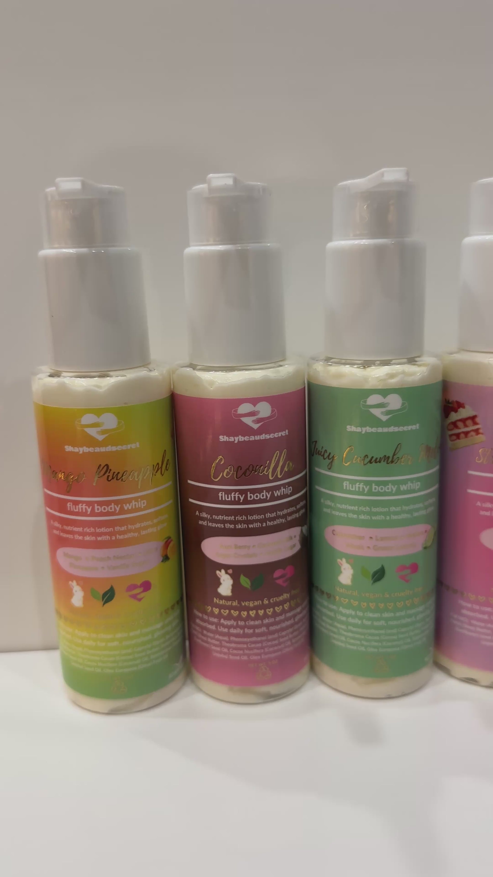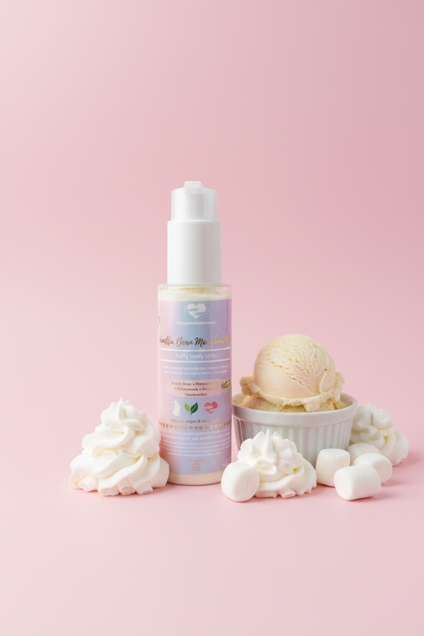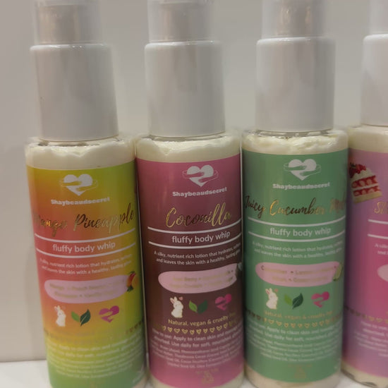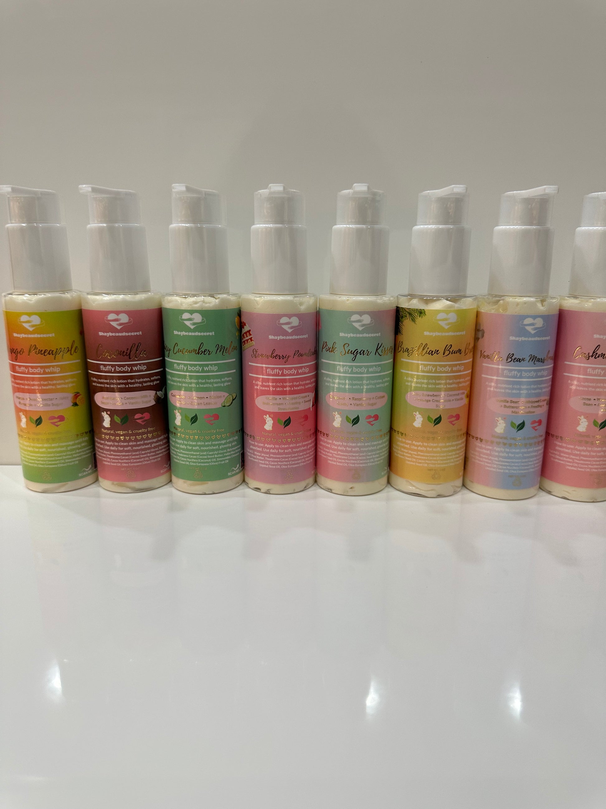 Our Fluffy Body Whip is a rich, whipped body lotion that melts into the skin for deep moisture, long lasting softness, and an irresistible scent that lingers. It’s light and airy in texture, but serious about hydration, leaving your skin smooth, plush, and touchably soft without feeling heavy or greasy.